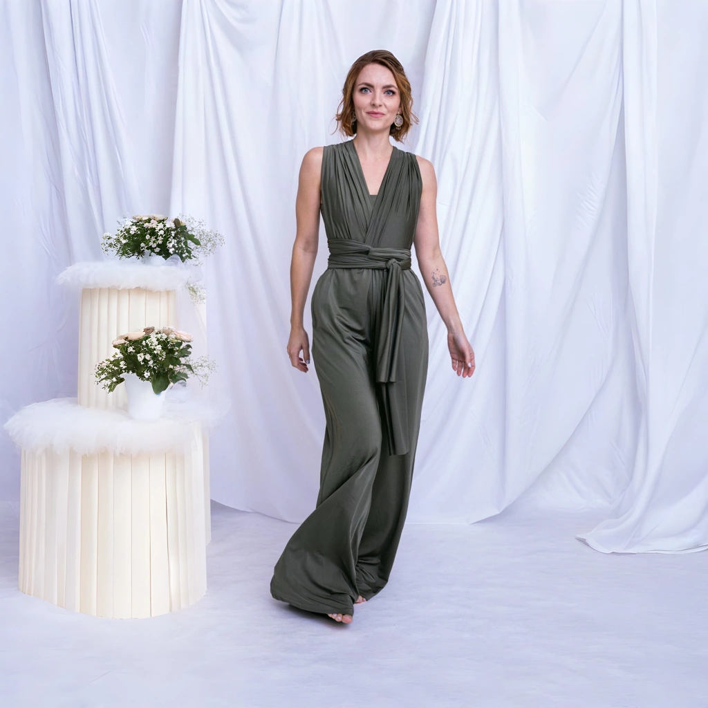 Unser Wickel-Jumpsuit vereint Komfort und Stil in einem trendigen Design und ist erhältlich in denselben Farben und Stoffen wie unsere Wickelkleider.